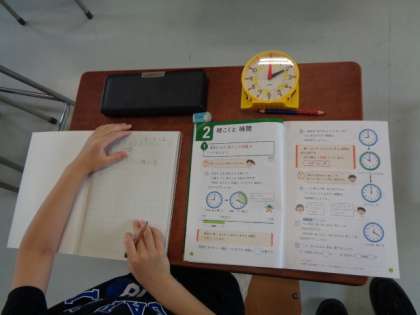 時刻と時間の違いを学習しました。これは2年生にとってとても難しい定義です。使い分けがうまくできるかな。