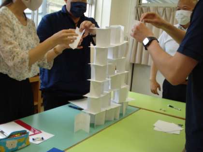 段階的な分散登校から、通常授業に移行することをふまえ、先生方も様々な準備をしています。「学級開きの研修」は小松先生が講師となって、様々な楽しいゲームを先生方で体験しました。「アレルギー対応研修」では、22日から始まる給食に備えシュミレーションをしました。