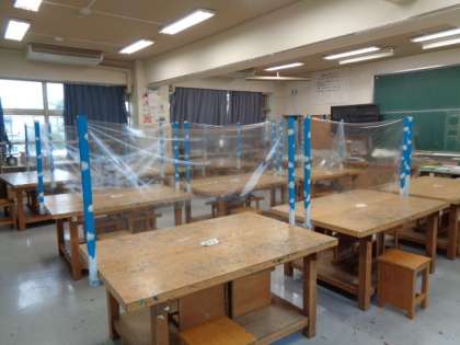 今日初めて、1,2年生が全員登校しました。初めて顔を合わせる友達と自己紹介をしました。座席を離して配置したり、パーテーションを作ったりして来週からの授業に備えています。