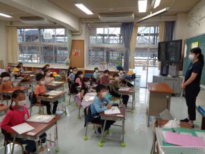 朝の放送朝会からのスタートです。友達との距離はとらなくてはなりませんが、そんな時こそ心の距離は近づけられよう頑張りましょうと、校長先生からのお話がありました。姿勢を正してしっかりとお話を聞けました。