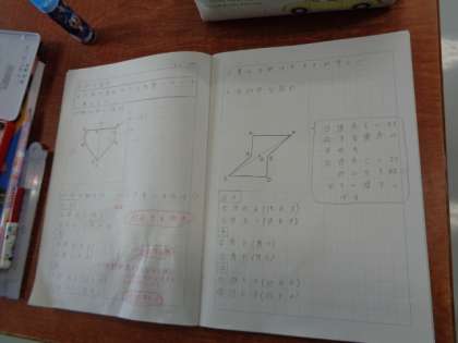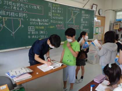 線対称な図形、点対称な図形において『対応する』頂点・角・辺について学習しました。ノートに学習したことを丁寧にまとめていました。