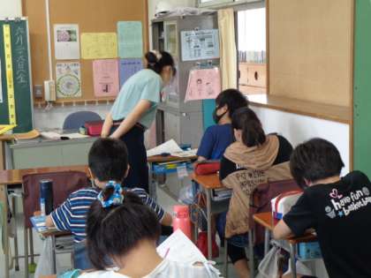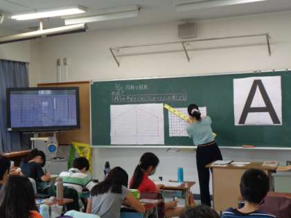 アルファベットの中から線対称、点対称な図形を見つけました。線対称な図形をかくにはどんな性質を使ってかくのか考えました。