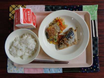 ごはん さばのごまだれ焼き きゃべつのおかか味 牛乳