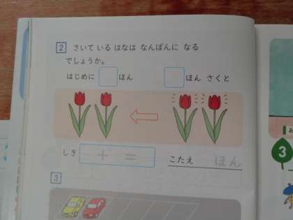 あわせていくつをキーワードにたし算の式に表わします。「チューリップはあわせて何本になるかな。」