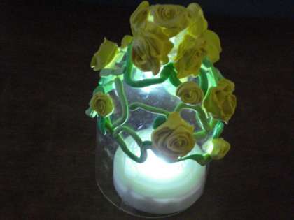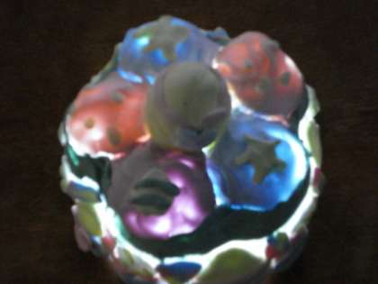3年生の図工では、ペットボトルに色をつけた紙ねん土をはりつけ、ランプシェードを作りました。今日は、作品の「点灯式」です。子どもたちが校長室に呼びに来てくれました。