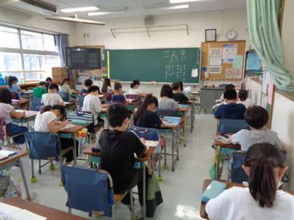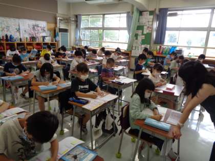 姿勢を正して、漢字ドリルに一文字一文字丁寧に書いて練習しています。積み重ねが大切ですね。