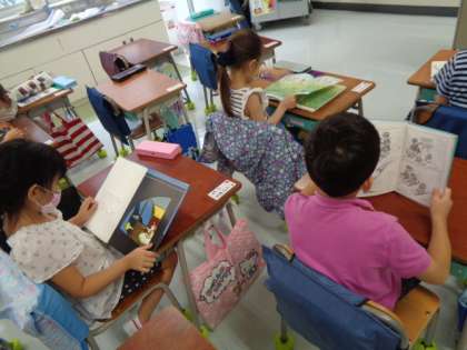 ひとりひとり図書室から借りてきた本を一生懸命に読んでいました。興味のある本は人それぞれです。個性が出ていました。
