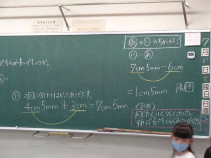 ものさしを使ってmmまで長さをはかりました。どちらが長いかな?