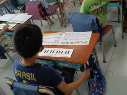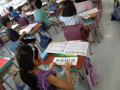 鍵盤ハーモニカを使えないので、紙製の鍵盤で練習しています。上手に指運びができたかな。