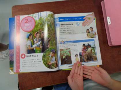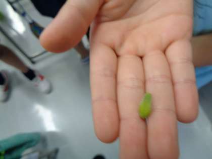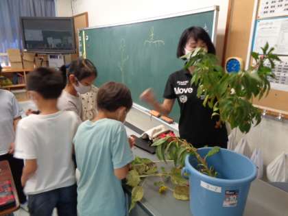 花が咲き終わった後のホウセンカを観察しました。小さな実を見つけよく観察しました。ひまわりは実ができる前にほとんど枯れてしまったそうです。