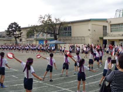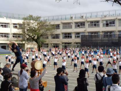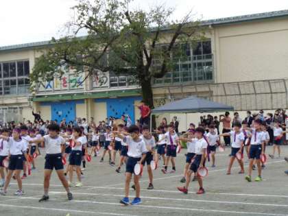 沖縄のリズムに合わせた準備運動から始まり、かけっこ、エイサーと3年生オンステージでした。