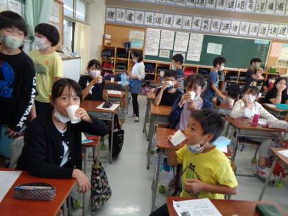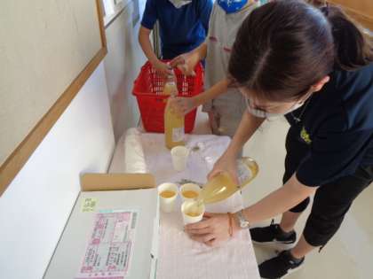 5年生に川場村から『リンゴジュース』が届きました。しっかりと学習をしてから美味しくいただきました。