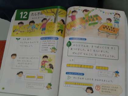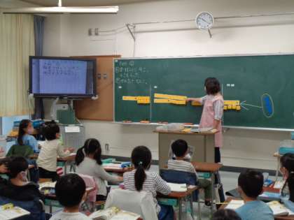 いよいよ繰上りのあるたし算の学習です。9+4=13をブロックと図をつかって計算の仕方を説明しました。