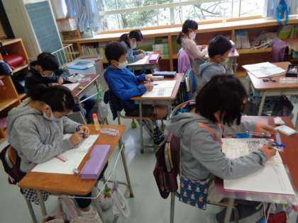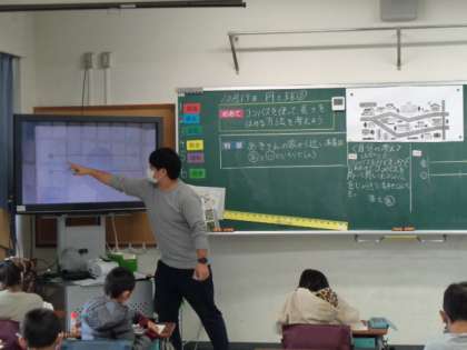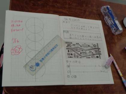 コンパスを使って長さをうつす学習です。片手でコンパスを扱うのは難しいようです。