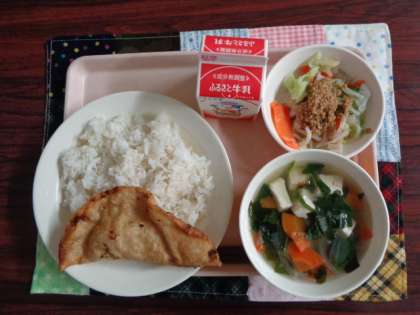 ごはん 揚げぎょうざ きゃべつともやしのごまだれ わかめスープ 牛乳