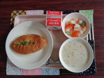 ガーリックトースト じゃがいもサラダ コーンポタージュ 牛乳