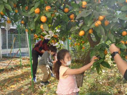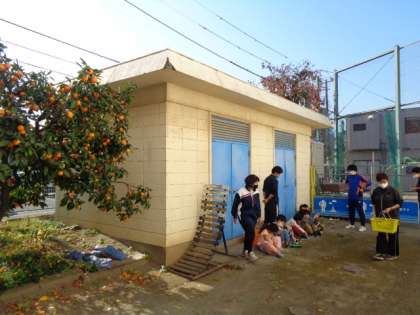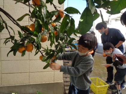 6組の教室の横に植えてあるミカンの木に実がたくさんなりました。低学年の子どもたちがミカン狩りを楽しみました。今年は豊作です!
