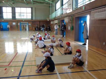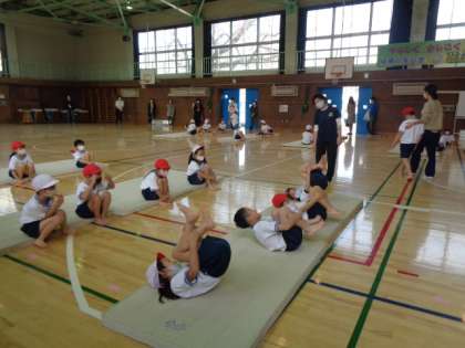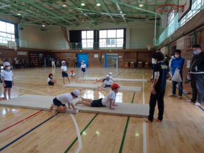 くま・あざらし・うさぎ・かえるなどなど動物になりきって、マットの上で遊びました。たくさんの保護者の方に見てもらい張り切って頑張りました。準備も後片付けも上手にできました。