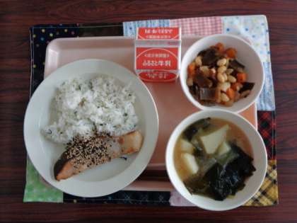 わかめごはん さけの南部焼き 五目豆 みそ汁 牛乳
