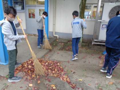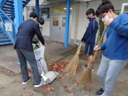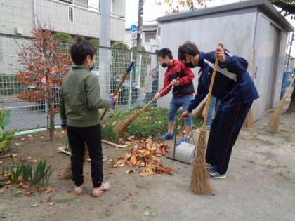 小春日和の1日、弦巻中学校の生徒たちと、5、6年生の環境委員が一緒に、弦巻中学校、弦巻小学校の落ち葉掃きを行いました。