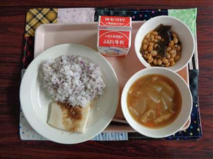 ゆかりごはん いかの一味焼き ぶどう豆 呉汁 牛乳