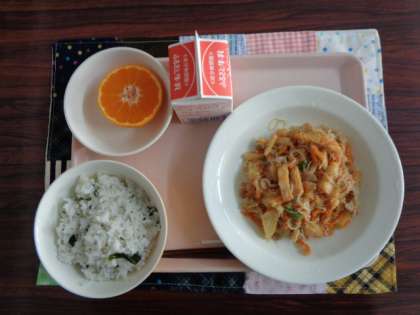 わかめごはん きんぴら煮 花みかん 牛乳