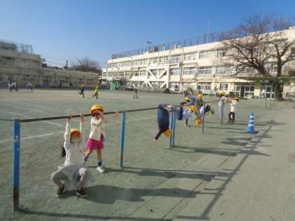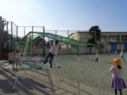 暖かくなった昼休みに、校庭でたくさんの1年生が遊びました。遊具も使えるようになって楽しく遊べました。