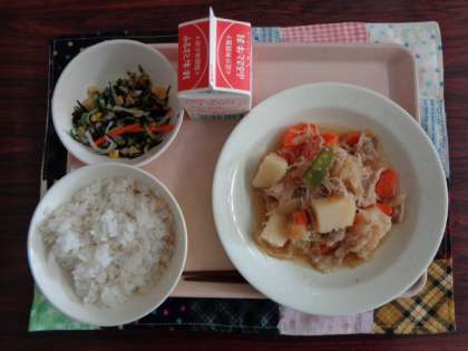 ごはん 肉じゃが だいこんとひじきのサラダ 牛乳