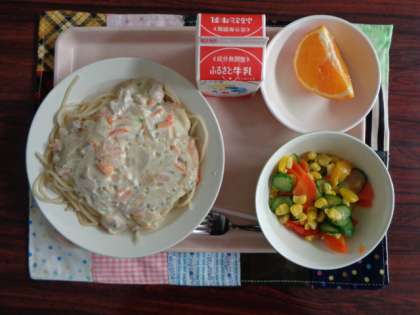 スパゲッティホワイトソース カラフルサラダ 紅まどんな 牛乳