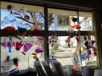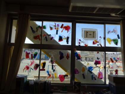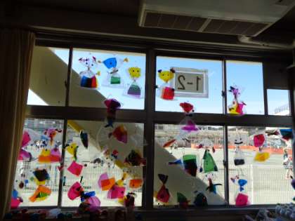 きれいな作品が教室の窓に飾ってあります。光を通して見るととてもきれいです。