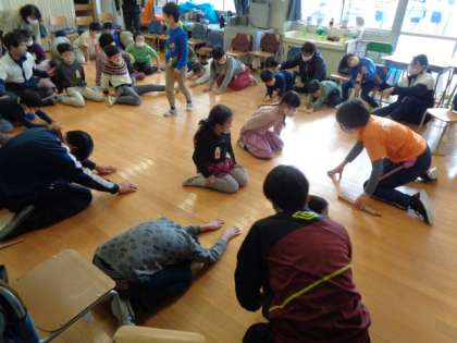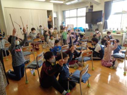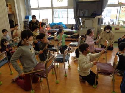ストレッチをした後、イスを使って防災頭巾を太鼓に見立てて、リズムよくたたきました。最後のポーズも決まって満足そうでした。わからないところ、難しいところを質問して練習しました。
