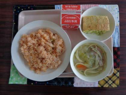 チキンライス ヌードルスープ 小松菜ケーキ 牛乳