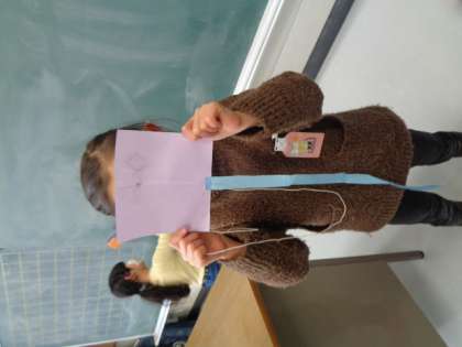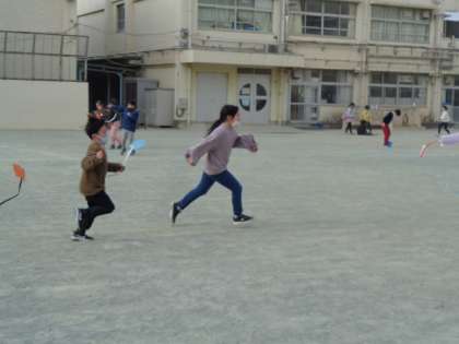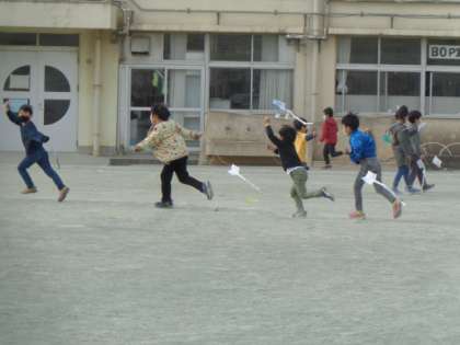 自分で作った凧を校庭で上げました。走っている間は上がるタコなので1年生の子ども達は、寒さに負けず走り回りました。