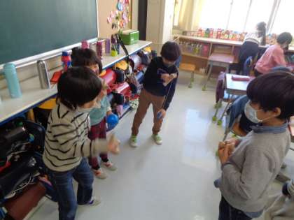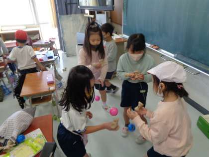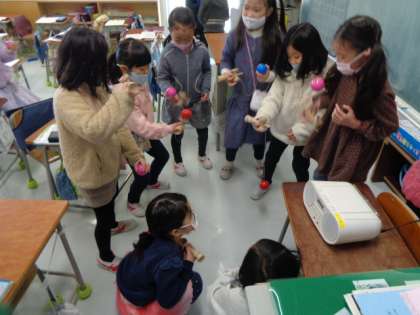 1年生では「けん玉」が流行っています。休み時間に外で遊べないときには教室で、「けん玉」を練習しています。流行りの音楽に合わて「もしかめ」?