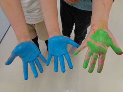 版画の学習です。カラフルな絵具を使ってききれいに仕上げました。切り抜いた形を上手に使って表現します。終わった後には手もカラフル?になってしまいました。