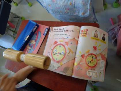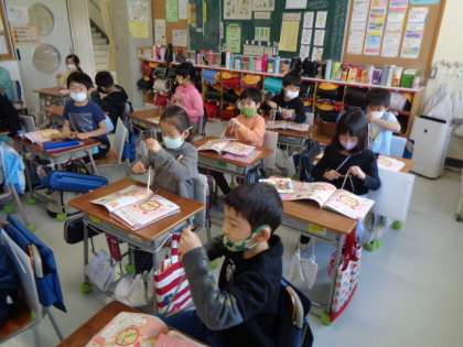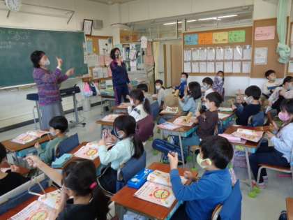 ウッドブロックやトライアングルを使って学習しました。耳を澄ませて楽器の音を聞き分けられたかな。