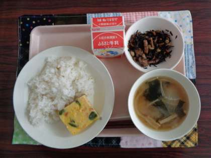 ごはん 卵焼き ひじきの炒め煮 みそ汁 牛乳