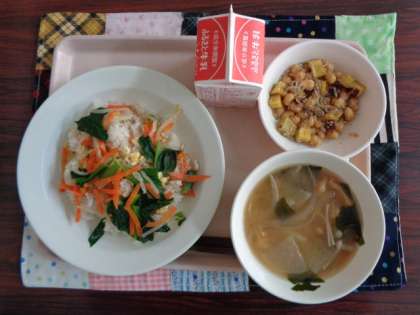 二色そぼろごはん 大豆とじゃこの甘辛煮 みそ汁 牛乳