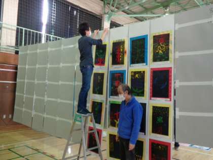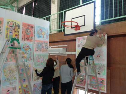 展示会の準備が始まりました。今日は子どもたちの平面作品を体育館に展示しました。色鮮やかに展示できるように工夫しました。鑑賞日が楽しみです。