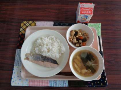 ごはん さけの塩焼き 五目豆 みそ汁 牛乳
