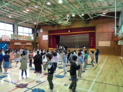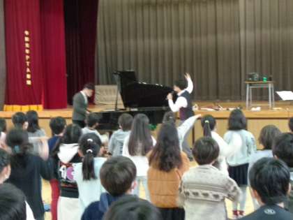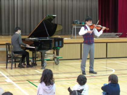 体育館にゲストティーチャーをお招きして、演奏を聞いたり、美しい歌声に乗って体を動かしたりして鑑賞会を行いました。子ども達だけでなく先生たちも笑顔にしてしまう音楽の力を感じました。