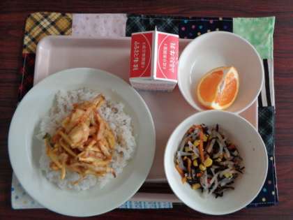 かき揚げ丼 だいこんとひじきのサラダ 清見オレンジ 牛乳
