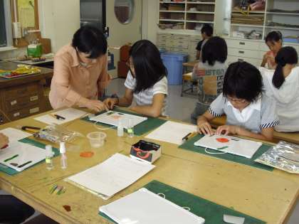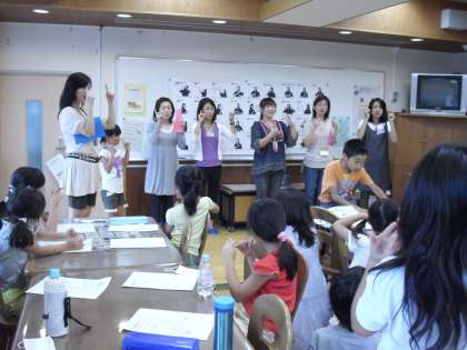 夏のワークショップは大賑わい。昨日に引き続き、図書室では“囲碁・将棋”、図工室では“グラスアート”、和室では“茶道”、そしてランチルームでは“手話であそぼう”が開かれました。