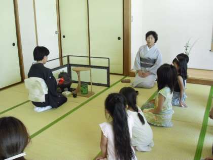 茶道は先生が入れてくださったお茶を一服、そのあと子どもたちは保護者の方に点てて上げて……背筋を伸ばしていました。