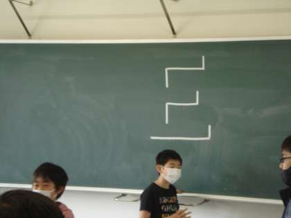 5年生の教室では、先生が黒板にクイズを出していました。