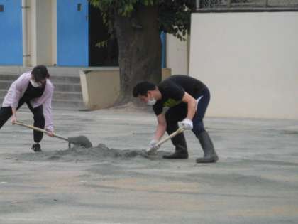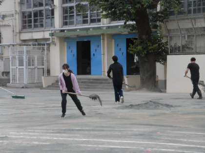 児童が給食を食べている間に、手の空いている主事さんや事務さん、先生方とまきました。大変な重労働なのですが、窓から「ありがとうございます。」「頑張ってください。」という子供たちの声に励まされました。