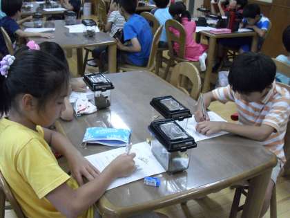 もうひとつのワークショップは“スズムシをかおう”(ランチルーム)です。スズムシの一生や飼い方について、おはなししていただきました。秋にそれぞれのおうちでスズムシのすてきな鳴き声がきけるといいですね。