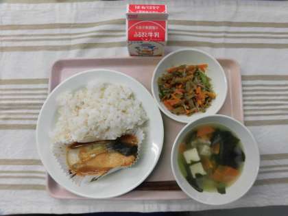 麦ごはん 鮭のみそマヨネーズ焼き わかめスープ きんぴらごぼう 牛乳