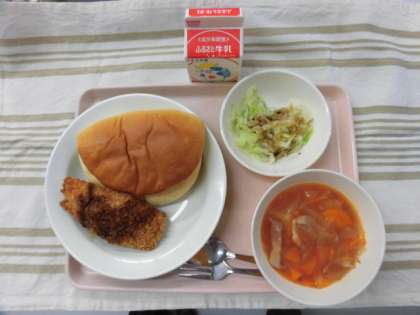 ミルクパン 鮭フライ ボイルキャベツ ミネストローネ 牛乳