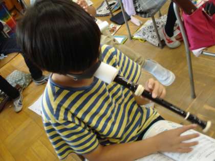 飛沫防止の工夫をして、リコーダーの練習をしています。